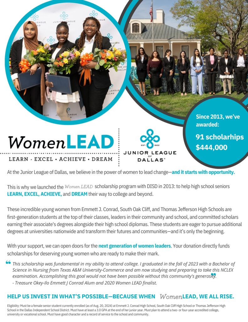 - 2025-2026 Application Workshops – A chance for potential applicants to learn about the Junior League of Dallas, the Women LEAD Scholarship, and the application process. During this session, applicants can ask questions about the steps needed to apply. 2025-2026 Application workshop dates are coming soon. Please check with your guidance counselors for more information.